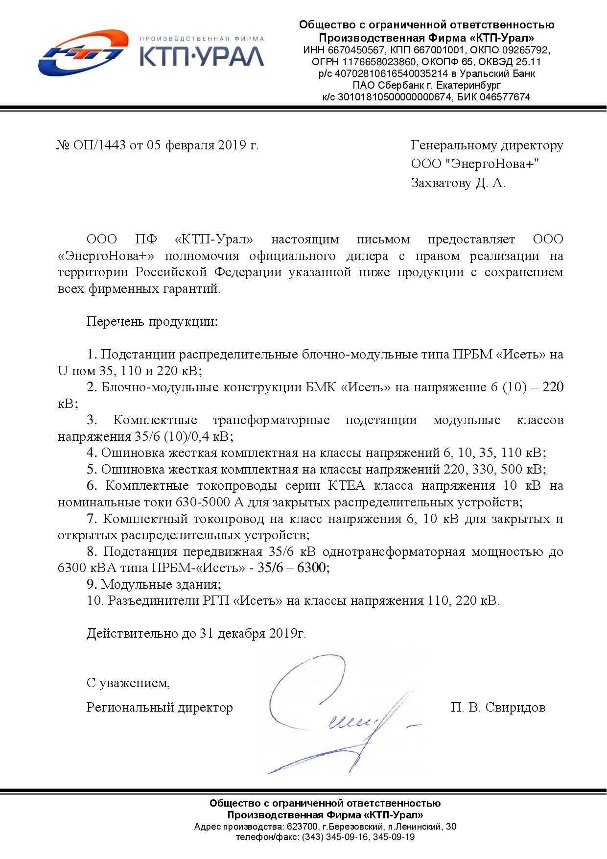 Мы рады сообщить о получении статуса Официального дилера ООО ПФ «КТП-Урал» с правом реализации продукции компании с сохранением всех фирменных гарантий на территории Российской Федерации. КТП-Урал – это надежный производитель комплектных трансформаторных подстанций и энергетического оборудования для строительства, реконструкции и технического перевооружения электросетевых объектов на класс напряжения до 500 кВ.